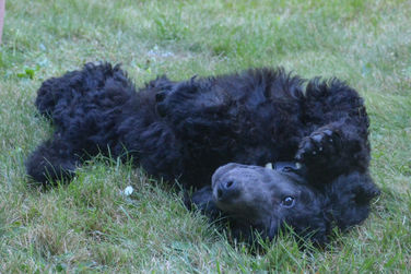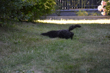 Staramy się zachować odpowiednią równowagę, między czasem jaki spędzają z przedstawicielami swego własnego gatunku, a nami ludźmi, tak aby szczeniak wiedział, do jakiego gatunku należy, a jednocześnie rozumiał i akceptował zasady życia w społeczności ludzi. Maluchy uczą się od siebie, od matki i cioć podstawowych umiejętności psiej komunikacji, właściwych zachowań społecznych, interpretacji wysyłanych sygnałów i odpowiedniej reakcji na nie. Nabierają umiejętności samokontroli, zwłaszcza hamowania siły ugryzienia- w trakcie przepychanek, kto słabszy, a kto silniejszy. W sezonie letnim nasze szczeniaki zaczynają wychodzić na taras i pobliski trawnik już w wieku ok 4,5 tygodnia. Tam poznają trawę mokrą i suchą ,wiatr i krzaczki, tunel agility i oponę , a gdy jest gorąco to i płytki basenik wypełniony wodą. Kąpiel w nim to kolejna okazja do użycia suszarki :) Szczenięta biegają po różnych powierzchniach, mają szansę się zmęczyć, a potem wyciszyć w domu i zasnąć. Szybko zaczynają też załatwiać swoje potrzeby fizjologiczne, najpierw na tarasie, a wkrótce i na trawie. W ogrodzie poznają dzwięk kosiarki, przejeżdżającej karetki, czy wyjącego syna sąsiadów.